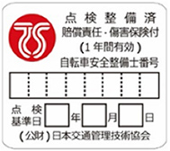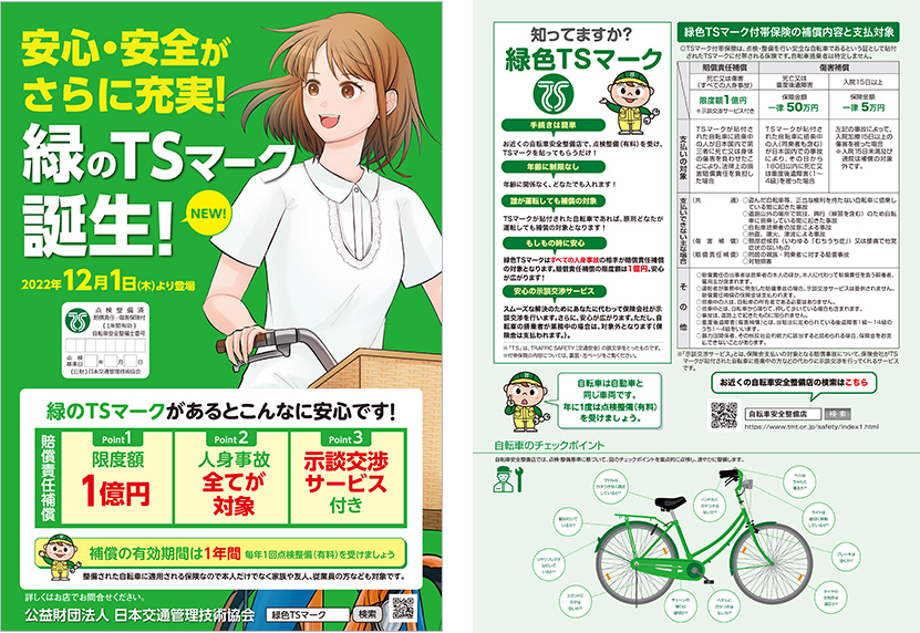TSマークとは、資格を持った自転車安全整備士が自転車を点検整備して、基準に適合した自転車に貼るマークのことです。点検整備を受けた自転車に乗るように努めましょう。また、このTSマークを貼った自転車に乗っていれば、万一の交通事故の際に、賠償責任保険金と傷害保険金が支払われます。